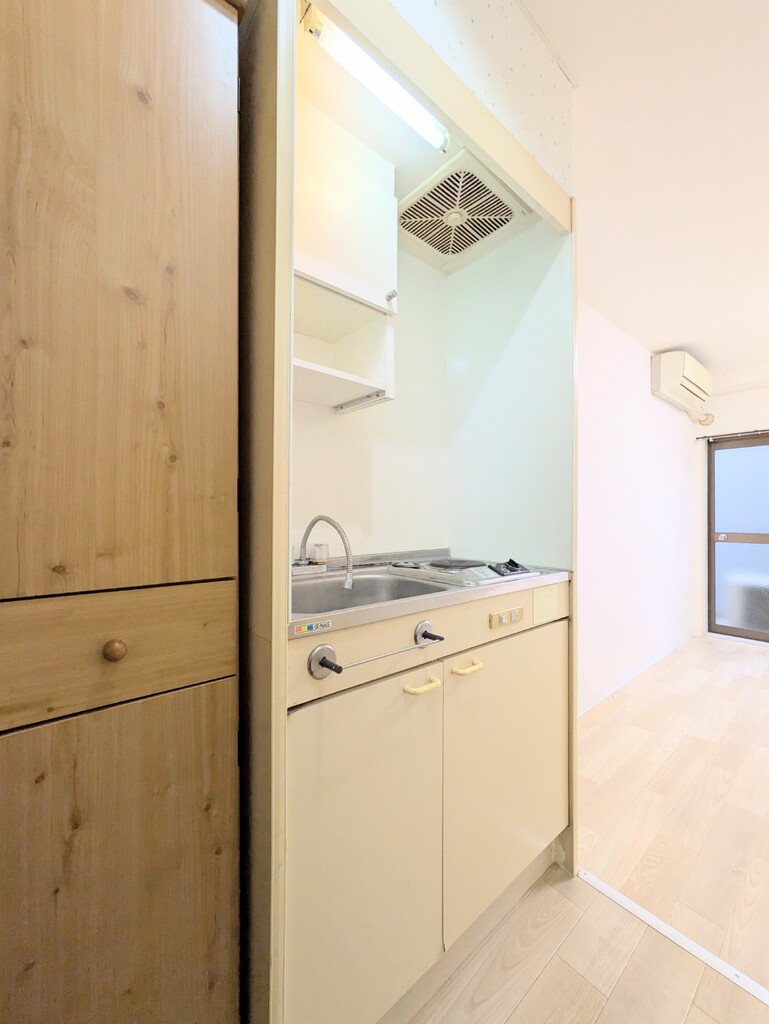 | 設備 | 給湯、BT同室、シャワー、洗面台、温水洗浄便座、3点給湯、2面採光、収納、クロゼット、下駄箱、TVモニタ付ドアホン、ゴミ置場、駐輪場、インターネット接続可、地上デジタル、敷地内ゴミ置き場、エアコン、都市ガス、室外洗濯機置場、電気コンロ一口設置済み | ||
