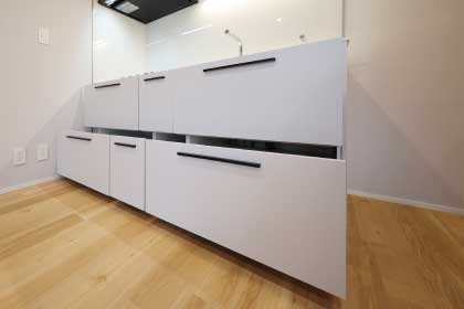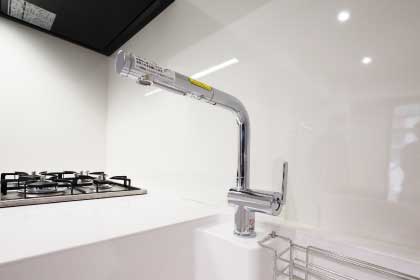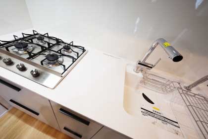 シンクとカウンターが、すべて「人造大理石」なので、隙間・段差がなく、シンクのふちまでお手入れ簡単。