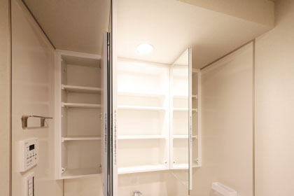 三面鏡の裏側には収納棚を確保。スキンケア用品やヘアケア用品などをすっきり整理できます。