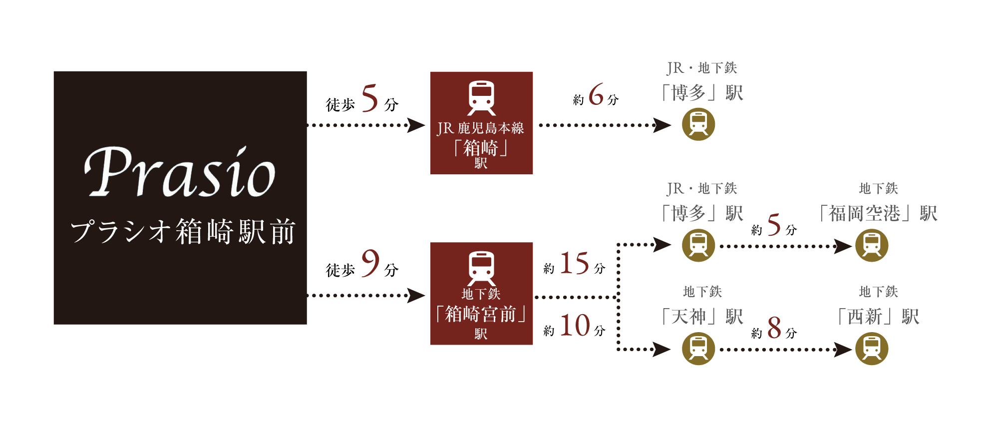 ※掲載の所要時間は、朝の通勤時(8:00発)「箱崎」駅よりJR鹿児島本線「箱崎宮前」駅より福岡市営箱崎線利用。